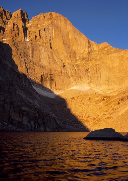 A golden Chasm Lake as first light strikes the Diamond Face of Longs Peak,