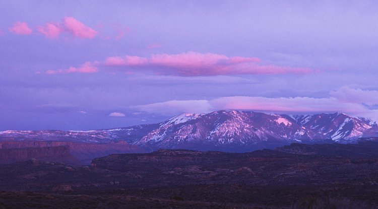 La Sal Mountains at sunset, Panorama Point, Arches National Park, Utah