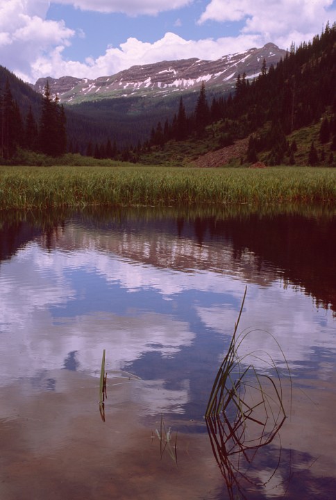 Cliffs at the head of the the Snowmass creek valley are reflected in still ponds upstream