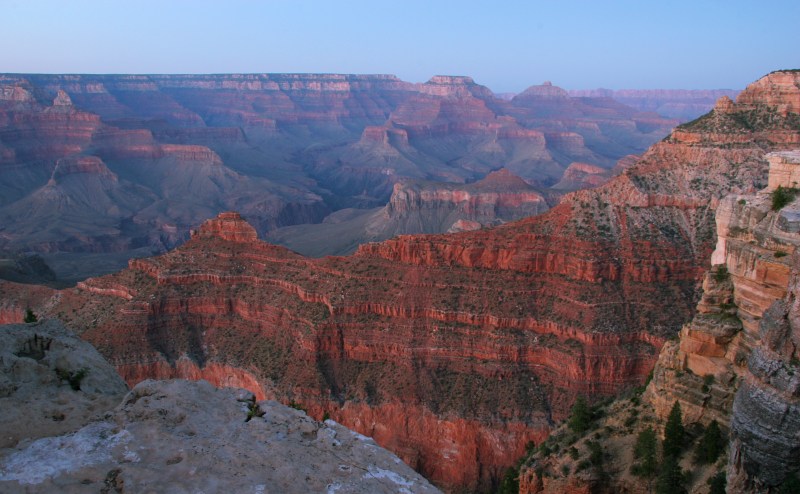 Soft light fills the canyon after sundown, seen from Mather Point on the South Rim.