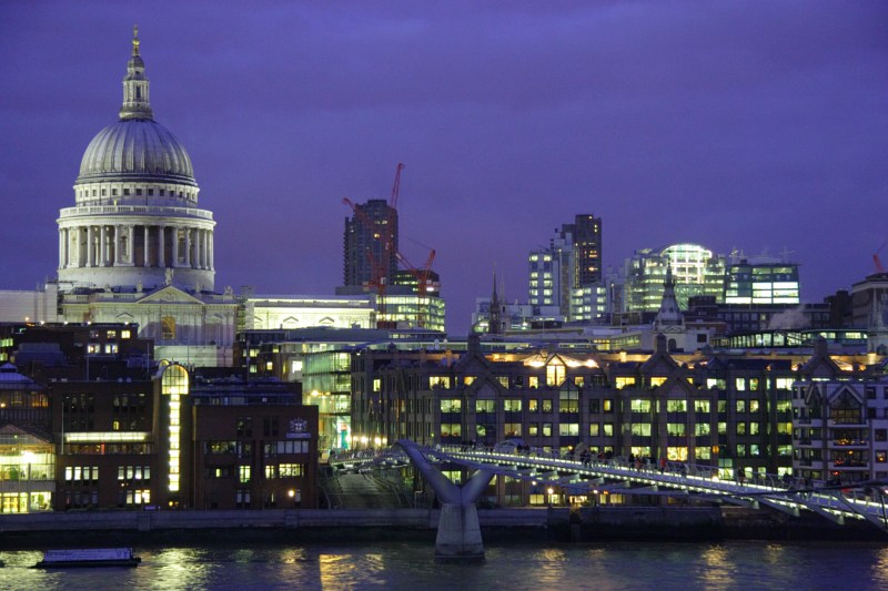 St Paul's Cathedral and the Millenium Bridge at twilight, seen from Tate Modern