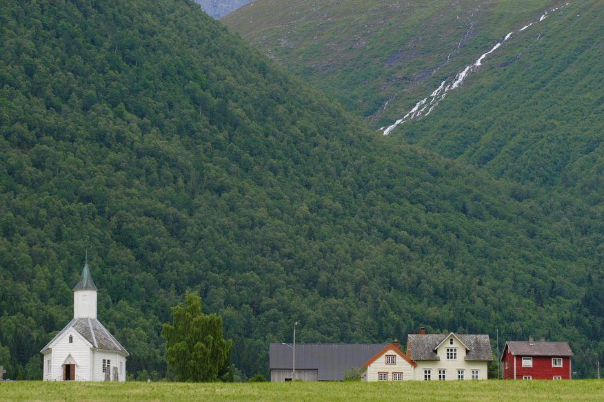 Loen's small church is framed by the lush slopes of the Lovatnet valley, at the head of the