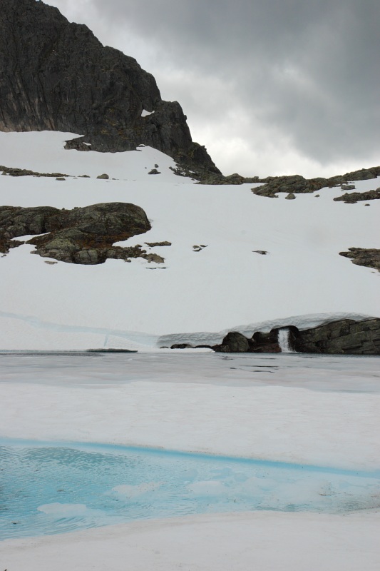 A frozen lake on the slopes of the Skala, in Jostedalsbeen National Park. Above about