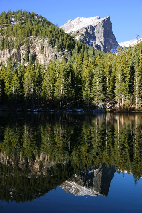 Reflection of Hallett Peak in still early morning air at Nymph Lake.