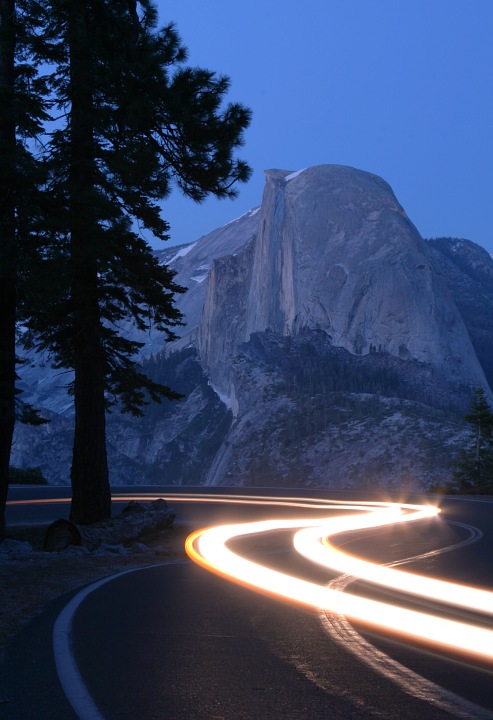Leaving Glacier Point at twilight, with Half Dome as a backdrop.